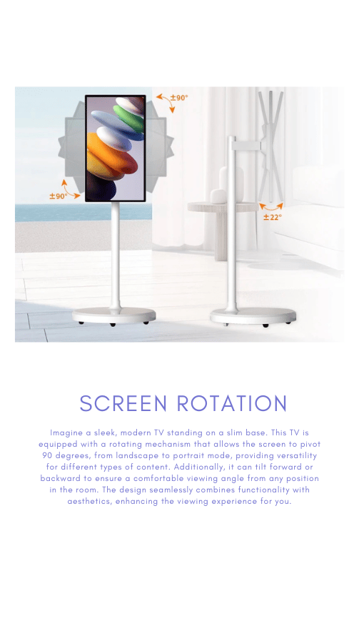A standing tv with wheels and a rotation screen, equipped with access to Google Play for your favourite app downloads, like a versatile explorer, rolling effortlessly through the landscape of entertainment, with its rotating screen serving as a compass, guiding users to new and exciting destinations in the digital realm.